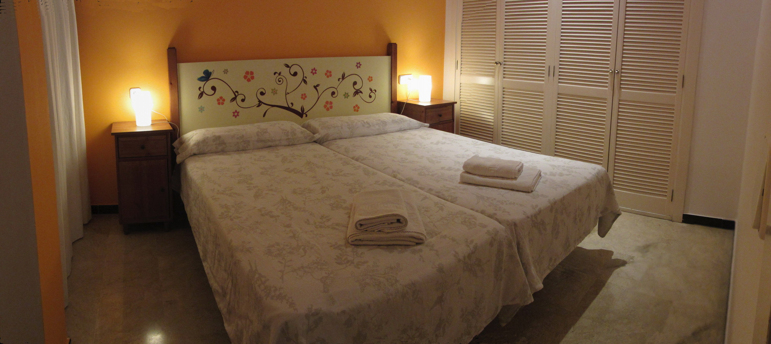 El dormitorio grande tiene dos camas, una de 135 y otra de 90, con sábanas, edredones, y en el armario o la comoda dispone de mantas en caso de ser necesario. Tiene una puerta de acceso a la terraza. Tiene aire acondicionado y ventilador de techo.